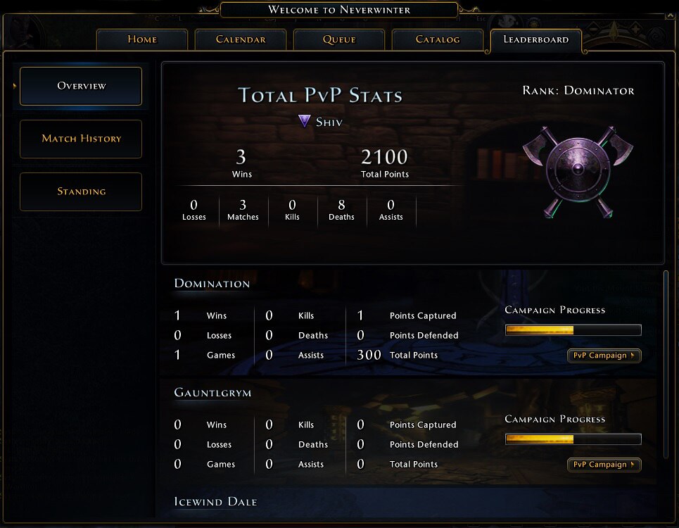 Durante a sua Domination PvP, Gauntlgrym e Icewind Dale fósforos, suas estatísticas irá acumular e você vai progredir através da campanha PvP, alcançando determinados marcos, tais como: Capturar 100 pontos em Dominação, ganhar 75 mortes duplas em Icewind Dale, ou executar 150 jogadores em Gauntlgrym.